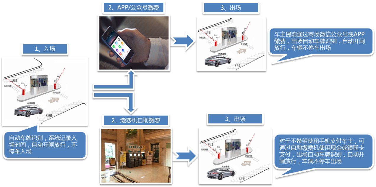 臨時(shí)車輛車牌識(shí)別不停車進(jìn)場(chǎng),手機(jī)/自助繳費(fèi)機(jī)自助繳費(fèi)后不停車出場(chǎng),給臨時(shí)車輛帶來極佳的停車體驗(yàn)。